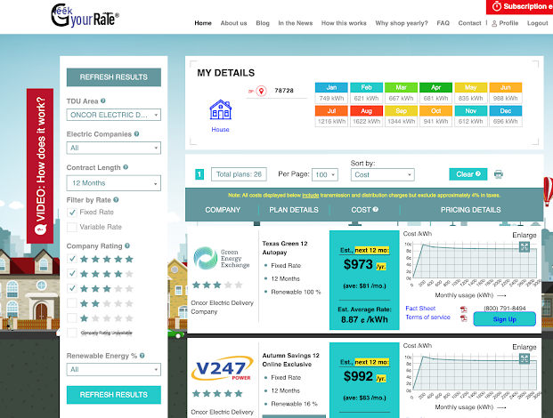 In Texas we have the luxury (duty?) to select an electrical provider and a plan. We have http://powertochoose.org/, the official website of the Public Utility Commission of Texas to help Texans select a provider and a plan.